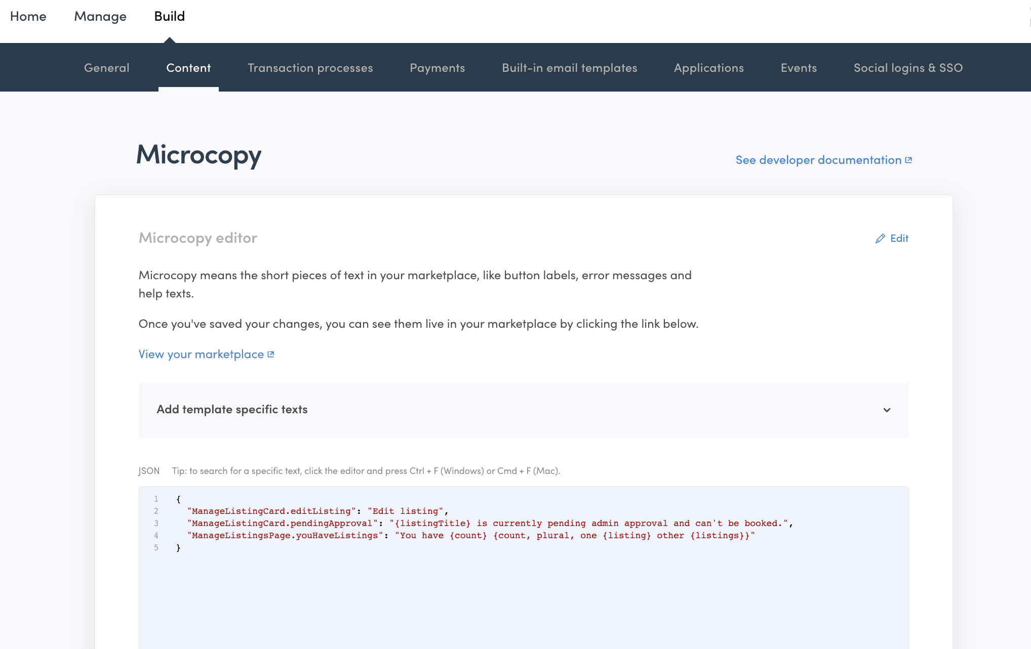 Microcopy refers to all the small pieces of text in your marketplace's dynamic pages – button labels, error messages, and help texts are all examples of microcopy. Modifying microcopy to match your marketplace's theme and tone of voice is a key task in customizing any marketplace. Read more about marketplace microcopy.