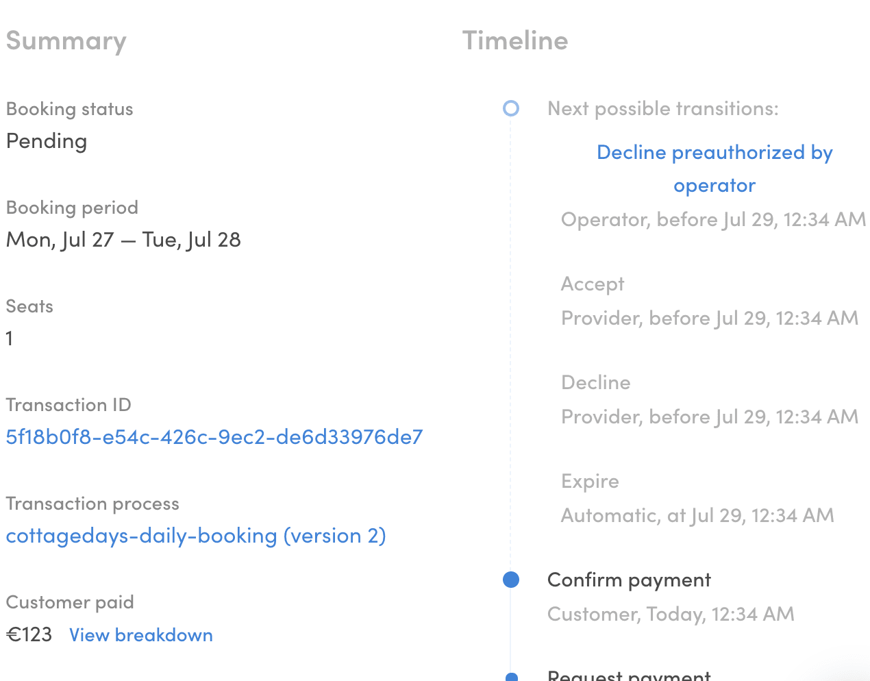 Here's a screenshot of the transaction card in the Flex Console. It shows a transaction in the preauthorized state - the decline link for the marketplace operator is on the right-side column.