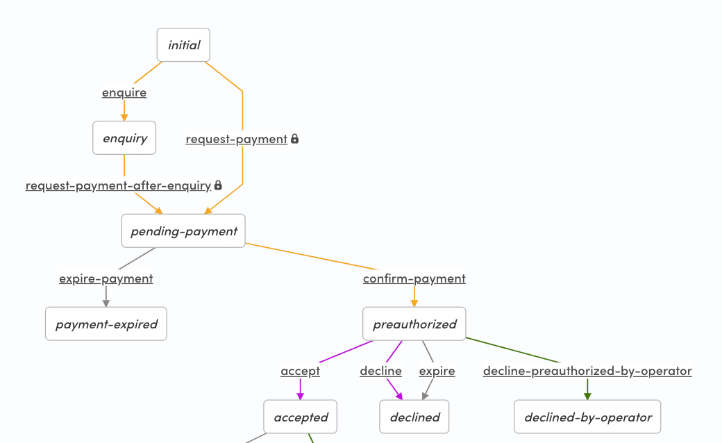 :to :state/declined-by-operator}With this configuration, we are creating a new transition called :transition/decline-preauthorized-by-operator for the operator. Because it's called before the provider has accepted the booking, it's using :action/decline-booking instead of :action/cancel-booking. Otherwise, the actions are the same as in :transition/cancel. We calculate refunds and refund the payment through Stripe. If you want to check all the possible actions, you should read this document: Transaction process actions.